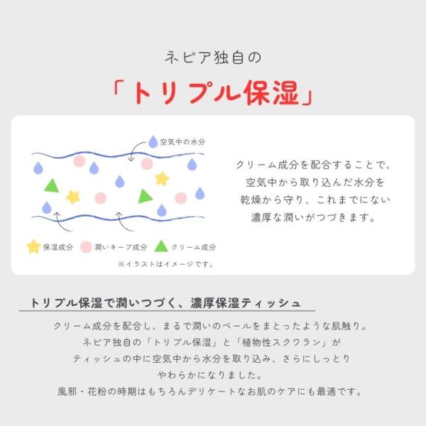 内容量:400枚(200組)×3箱/セット新たにクリーム成分を配合し、まるで潤いのベールをまとったような肌触り。ネピア独自の「トリプル保湿」と「植物性スクワラン」がティシュの中に空気中から水分を取り込み、さらにしっとりやわらかになりました。かぜ・花粉の時期はもちろんデリケートなお肌のケアにも最適です。