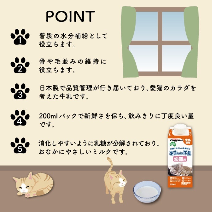 ●成長が著しい幼猫向けに成分調整した毎日おいしく与えられる牛乳です。