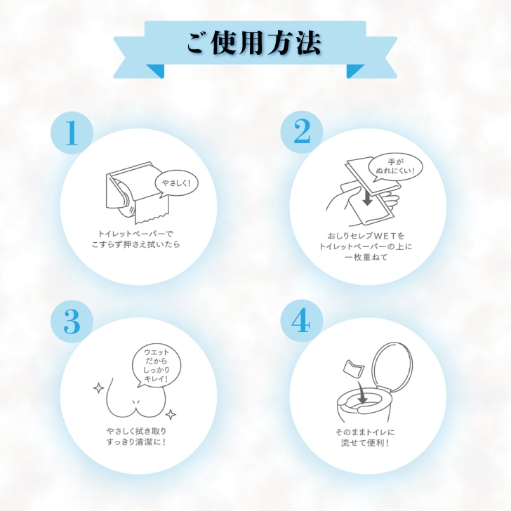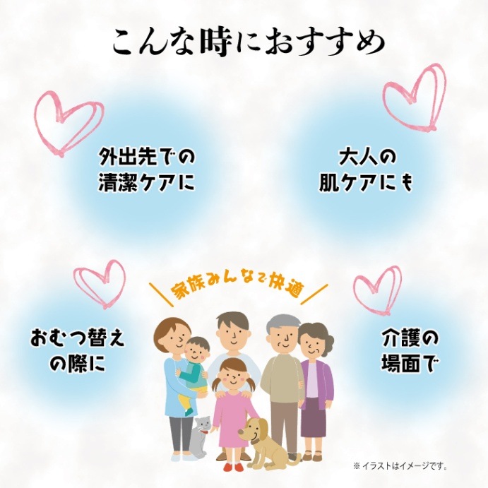 水の流せるウェットタイプのトイレットペーパー肌ざわりの良い天然パルプベースの水解性不織布を採用し、使用後はそのままトイレに流せます。